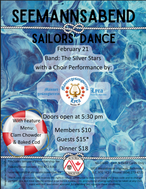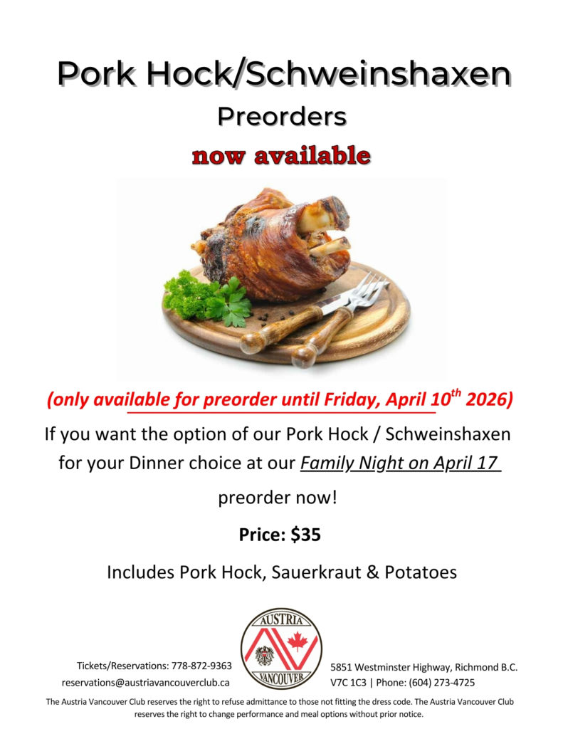 Our Annual Vienna Evening event will be held on Saturday, March 7th, 2026. This is a formal event and our dress code is Suits/tuxedos & cocktail dresses, gowns. When you purchase your ticket, please indicate your dinner option. Dinner will be served while you enjoy dinner music before the band begins.