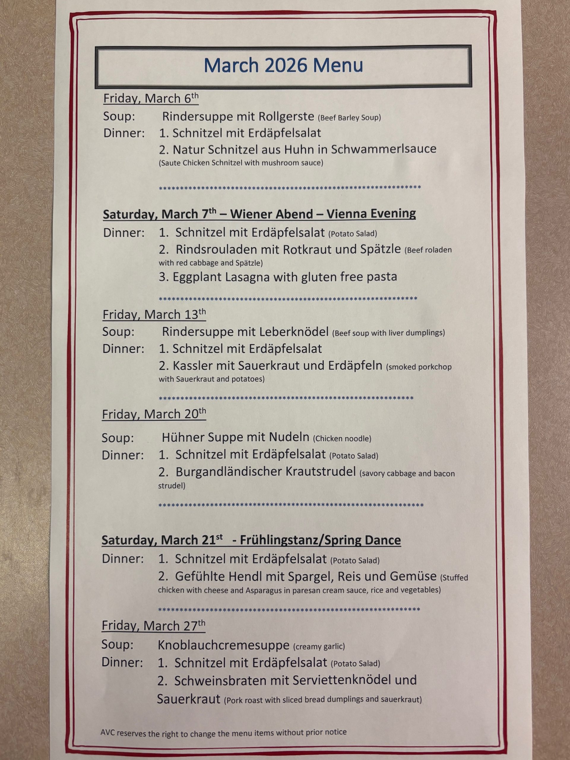 We offer a selection of Austrian food at our events. They are prepared in-house by our volunteers and are served fresh on the day of the event. While we always offer our Schnitzel with Austrian potato salad, our second meal and soups vary every week.