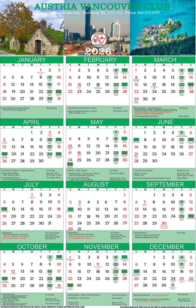 Our Annual Vienna Evening event will be held on Saturday, March 7th, 2026. This is a formal event and our dress code is Suits/tuxedos & cocktail dresses, gowns. When you purchase your ticket, please indicate your dinner option. Dinner will be served while you enjoy dinner music before the band begins.